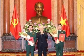 越通社河内——越共中央总书记、国家主席、中央军委书记、国防安全委员会主席、武装力量统帅阮富仲1月22日上午在主席府向越共中央委员、国防部副部长阮新疆和武明良授予中将晋升上将军衔的命令状。