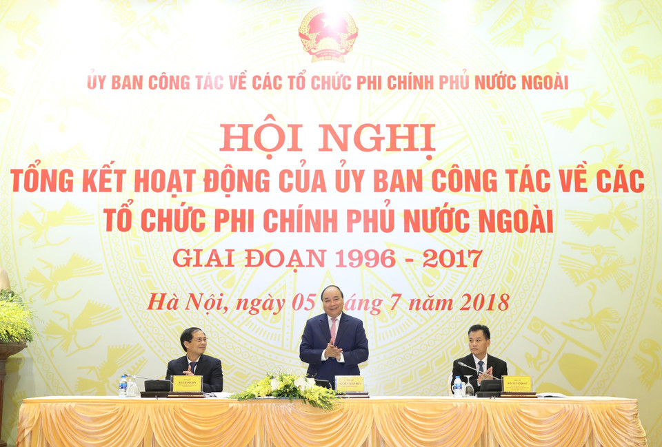 越南政府总理阮春福7月5日在河内出席越南外国非政府组织工作委员会(1996-2017年阶段)工作总结会议。