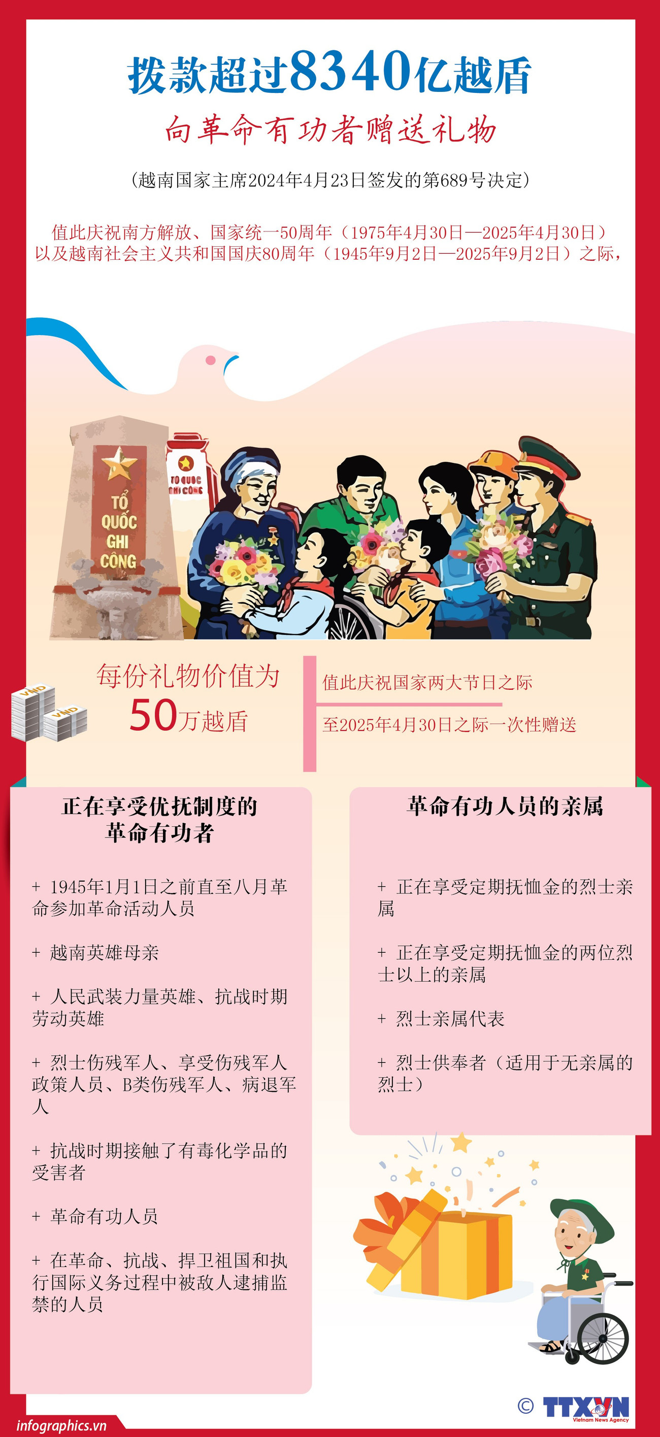 2025年4月23日,越南国家主席梁强签发关于值此庆祝南方解放、国家统一50周年(1975年4月30日-2025年4月30日)暨越南社会主义共和国国庆80周年(1945年9月2日-2025年9月2日)之际,向革命有功人员赠送慰问品的第689/QĐ-CTN号决定。