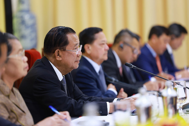 越通社河内——4月29日下午,越南政府总理范明政会见了前来出席纪念南方解放、国家统一50周年庆典(1975年4月30日-2025年4月30日)的柬埔寨人民党主席、参议院主席洪森。
