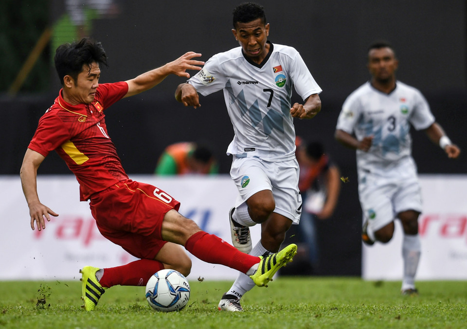 第29届东南亚运动会男足比赛B组揭幕战8月15日在马来西亚进行。越南时间15日下午15时,越南U22男足队(红衣)在吉隆坡士拉央体育场迎战东帝汶U22男足队。最终,越南队以4比0击败了东帝汶队,首战告捷。